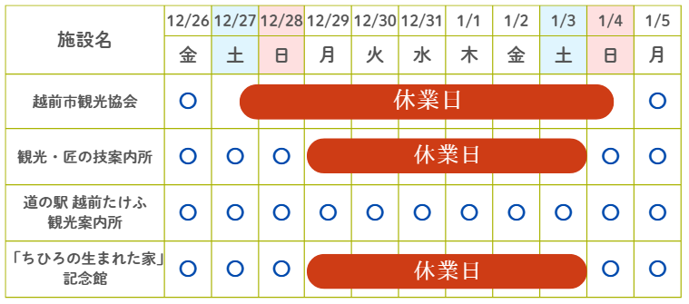 「(一社)越前市観光協会」、「観光・匠の技案内所」、「道の駅越前たけふ観光案内所」、及び「ちひろの生まれた家記念館」は、年末年始につき、