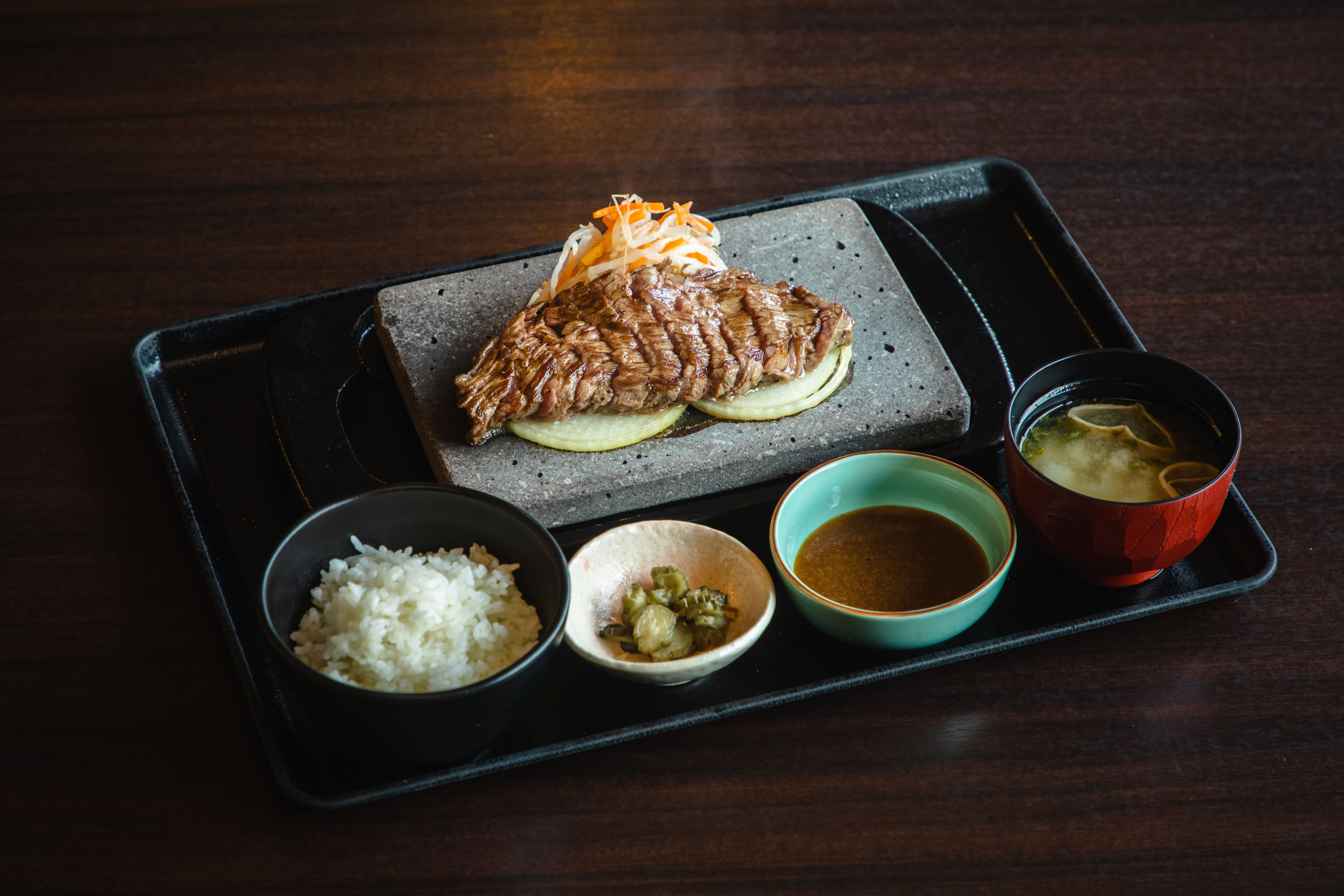 石焼ステーキ贅は、レアで提供されるこだわりのステーキを、アツアツの溶岩石で焼き上げるスタイルが特徴です。厳選された上質な肉は、外は香ばしく、中はジューシーな仕上がり。創業当時からあるオニオンソースは秘伝の味で、肉の旨味を最大限に引き立て、食欲をそそります。